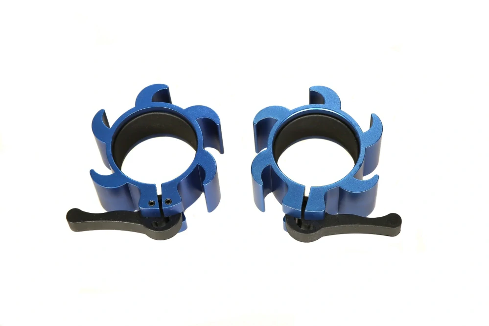 Hliníkové uzávěry pro olympijské osy – spolehlivá volba pro bezpečný trénink i závody. Tyto lehké, ale pevné uzávěry (tzv. „klapky“) slouží k rychlému a bezpečnému upevnění kotoučů na ose o průměru 50 mm.