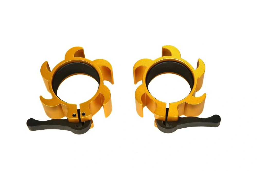 Hliníkové uzávěry pro olympijské osy – spolehlivá volba pro bezpečný trénink i závody. Tyto lehké, ale pevné uzávěry (tzv. „klapky“) slouží k rychlému a bezpečnému upevnění kotoučů na ose o průměru 50 mm.
